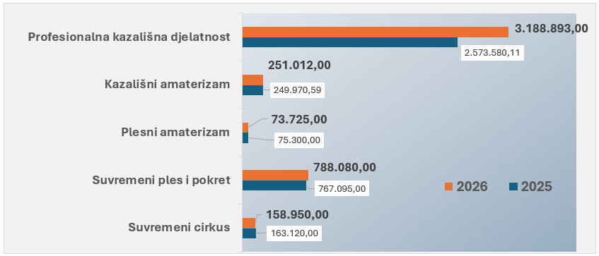 Na Poziv za predlaganje programa javnih potreba u kulturi za 2026. godinu, kazališnom amaterizmu odobreno je 89 programa festivala i manifestacija, gostovanja te redovitog programa i podržano s ukupnim iznosom od 251.012,00 eura. U plesnom amaterizmu odobrena su 33 programa festivala i manifestacija, gostovanja te redovitog programa s ukupnim iznosom od 73.725,00 eura.Programe kazališnog amaterizma vrednovalo je Stručno povjerenstvo za kazališni amaterizam u sastavu: predsjednik Robert Raponja te članovi Mario Kovač i Anđela Fržop, dok je programe plesnog amaterizma vrednovalo Stručno povjerenstvo za suvremeni ples i pokret te suvremeni cirkus u sastavu: predsjenica Larisa Lipovac Navojec te članice Silvija Marchig, Petra Glad Mažar i Antonia Kuzmanić.