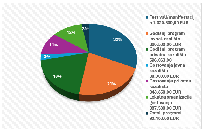 S ciljem osiguravanja održivosti, izvedivosti, umjetničke izvrsnosti i međusobnog umrežavanja, sredstva su dodijeljena programima koji su se istaknuli svojom kvalitetom. Posebna je pozornost bila usmjerena na realizaciju premijernih programa javnih (regionalnih) kazališta i privatnih kazališnih družina, odnosno umjetničkih organizacija, kao dodatni poticaj decentralizaciji, regionalnom kulturnom razvoju i jačanju izvaninstitucionalne scene. Najveći dio sredstava usmjeren je na programe festivala i manifestacija u području profesionalne kazališne djelatnosti, kao i na premijerne i reprizne izvedbe u suvremenom plesu i pokretu te redovite programe kazališnog i plesnog amaterizma.