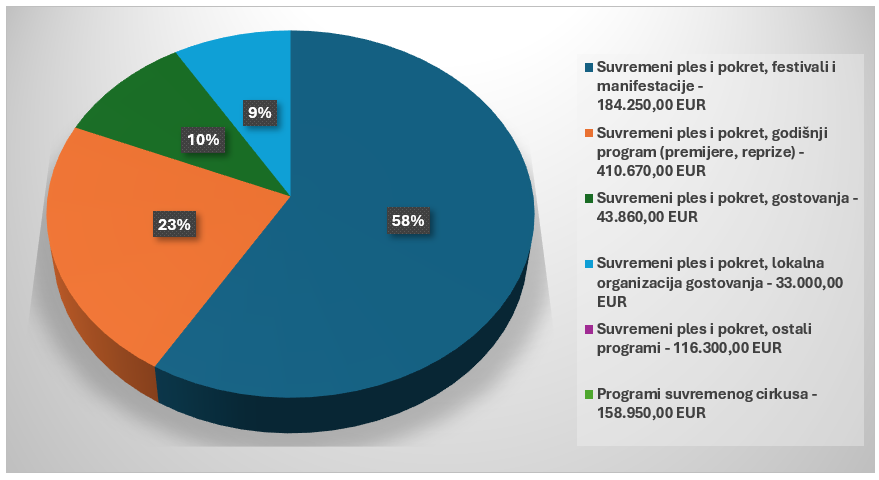Sredstva za programe suvremenog plesa i pokreta odobrena su u okviru potprogramskih djelatnosti festivala i manifestacija, gostovanja i lokalne organizacije gostovanja, premijernih i repriznih programa te ostalih programa, uključujući rezidencijalne, edukativne i druge programe. Također su podržani programi suvremenog cirkusa s ciljem osnaživanja i razvoja scene te povećanja prepoznatljivosti i vidljivosti cirkuske umjetnosti, uključujući festivale i manifestacije, pripreme i reprizne izvedbe cirkuskih predstava, programe gostovanja te edukativne i rezidencijalne programe.
