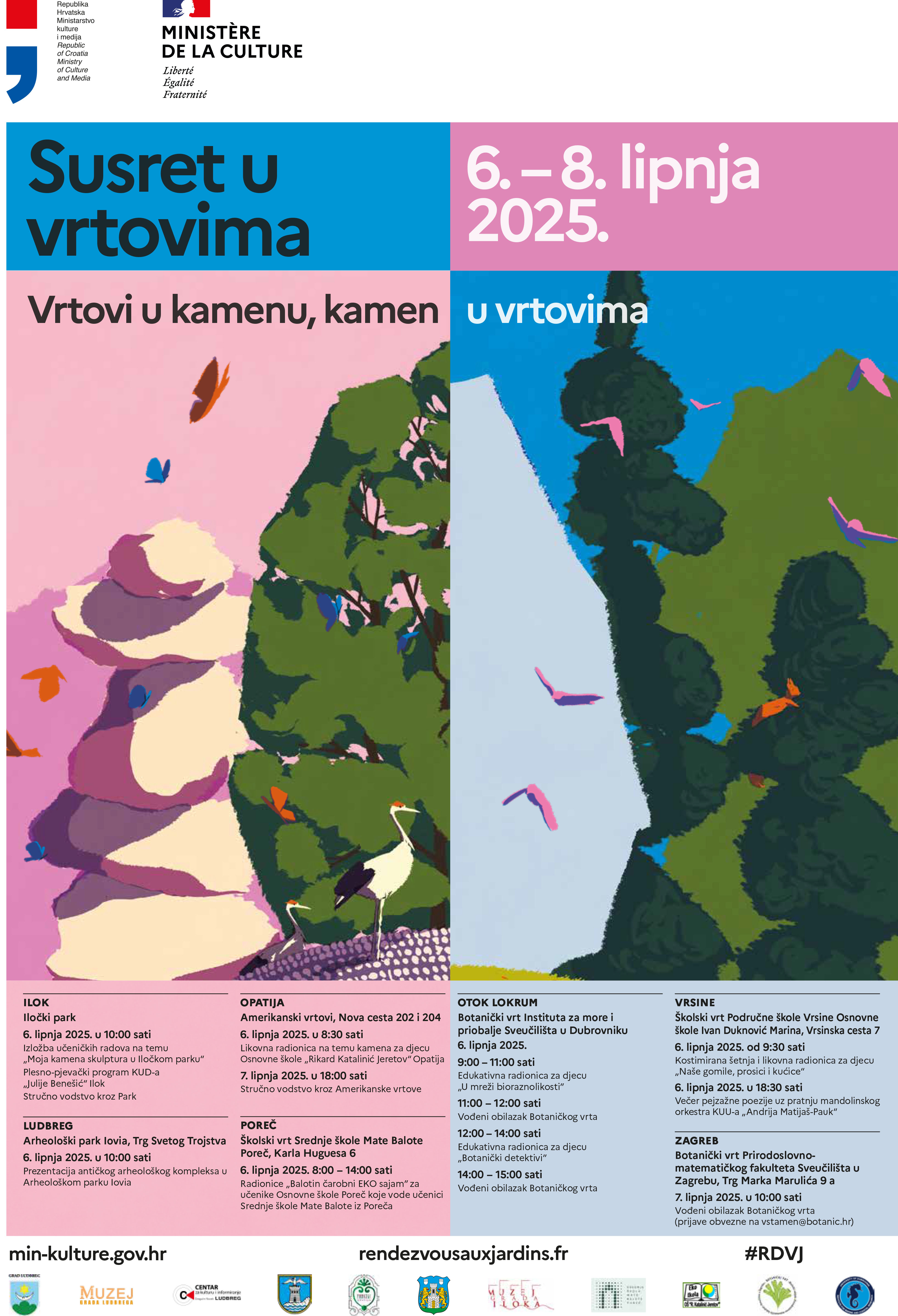 Under the coordination of the Ministry of Culture and Media, special educational programs were organized at seven location across Croatia, in Ilok, Ludbreg, Opatija, on the island of Lokrum near Dubrovnik, in Poreč, Vrsine and Zagreb, and assistance in the organization was provided by the Conservation departments of the Ministry of Culture and Media in Varaždin, Vukovar and Rijeka, the City of Opatija, Parkovi d.o.o. Opatija, the Ilok City Museum, the Ilok Tourist Board, the City of Ludbreg, the Ludbreg City Museum, the Dragutin Novak Ludbreg Culture and Information Center, the Institute for the Sea and Coastal Areas of the University of Dubrovnik in cooperation with DEŠA - Dubrovnik association, Mate Balota Secondary School Poreč, Vrsine Branch School of Ivan Duknović Marina Primary School and the Botanical Garden of the Faculty of Science, University of Zagreb. Some programs combined the event Rendez-vous aux jardins with the traditional event Days of Botanical Gardens.