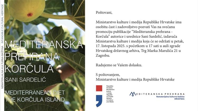 Ove godine Ministarstvo kulture i medija obilježava Međunarodni dan nematerijalne kulturne baštine predstavljanjem vlastitog izdanja „Mediteranska prehrana - Korčula” autorice i urednice Sani Sardelić, a svečana promocija publikacije održat će se u petak, 17. listopada 2025. godine s početkom u 17 sati u auli zgrade Hrvatskog državnog arhiva, Trg Marka Marulića 21 u Zagrebu.