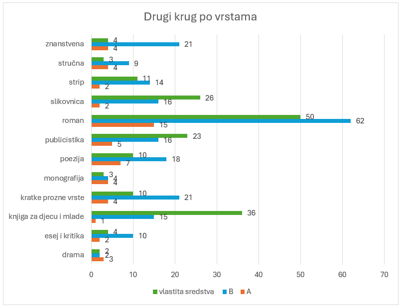 Kako bi se zadržali u okvirima sredstava dodijeljenih narodnim knjižnicama i zadovoljili najviše kriterije na popis A, u drugom krugu uvrštene su 54 knjige, na popis B 207 knjiga, dok 182 knjige knjižnice mogu nabavljati vlastitim sredstvima ovisno o potrebama i interesu korisnika.