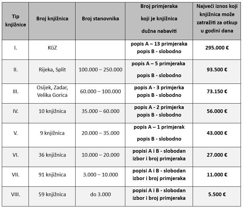 Knjižnice od I. do V. tipa dužne su kupiti najmanje 61 primjerak knjiga s popisa A te slobodno odrediti koje će knjige i u kojem broju primjeraka kupiti s popisa B, dok knjižnice od VI. do VIII. tipa mogu u skladu s odobrenim sredstvima kupovati knjige s popisa A i B u broju primjeraka koji najbolje odgovara potrebama njihovih korisnika.
