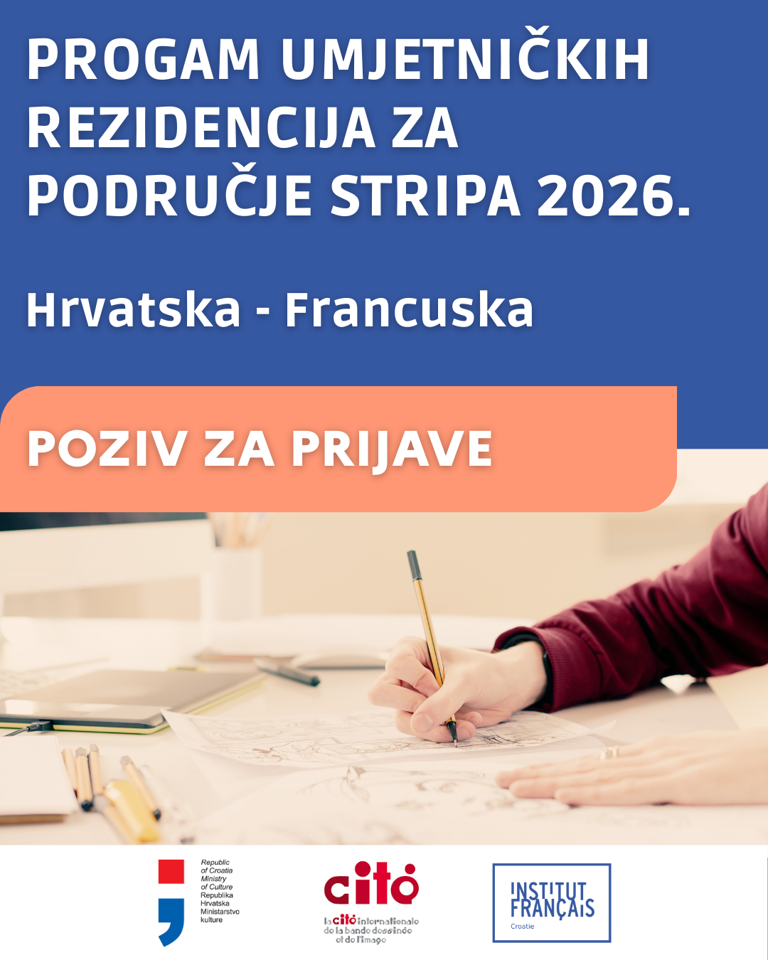1. rujna 2025. - Na temelju Sporazuma o suradnji na području stripa između Republike Hrvatske i Francuske Republike te Izjave o partnerstvu koju su potpisali naše Ministarstvo kulture i medija, Francuski institut u Hrvatskoj i Međunarodno središte stripa i slike (La Cité internationale de la bande dessinée et de l'image) Ministarstvo kulture i medija raspisuje Poziv za hrvatske umjetnike s područja stripa za boravak u umjetničkoj rezidenciji u Angoulêmu u 2026. godini.