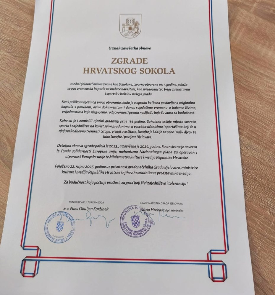 22. rujna 2025. - Ministrica kulture i medija dr. sc. Nina Obuljen Koržinek boravila je sa suradnicima u službenom posjetu gradu Bjelovaru gdje je uz bjelovarskog gradonačelnika Daria Hrebaka i župana bjelovarsko-bilogorskog Marka Marušića obišla ključne projekte ulaganja u kulturnu infrastrukturu Vlade Republike Hrvatske putem Ministarstva kulture i medija, koji će konstrukcijskom i energetskom obnovom kulturnih dobara unaprijediti kulturni i društveni život grada.