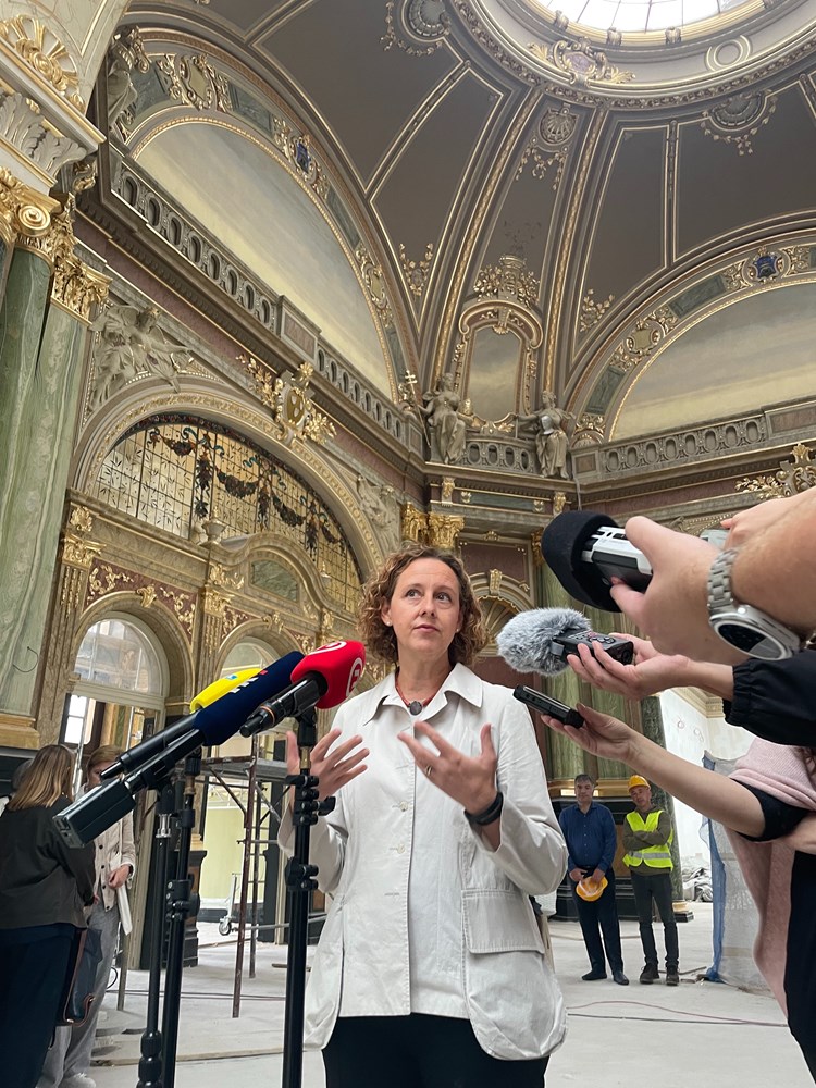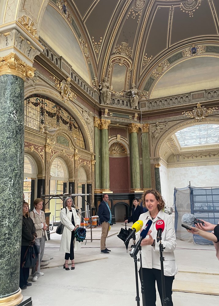 Izražavajući ponos što putem Ministarstva kulture i medija Vlada Republike Hrvatske obnavlja, a neke je već u cijelosti obnovila - ključne muzejsko-galerijske ustanoveministrica kulture i medija dr. sc. Nina Obuljen Koržinek posebno je naglasila kako su dvije zgrade koje je danas obišla sa suradnicima u prvoj fazi obnove bile najkritičnije od svih javnih zgrada u smislu potrošnje i realiziranja sredstava iz Fonda solidarnosti. Ministrica je podsjetila kako je Ministarstvo u gradu Zagrebu financiralo obnovu konkretno 123 zgrade, od svih sakralnih objekata, svih ustanova u kulturi, ureda Grada Zagreba, državnih ureda, ministarstva, sudova, palača HAZU-a i uredi ostale državne imovine. „Najveći dio sakralnih objekata je završen, ostali su radovi na Zagrebačkoj katedrali, na crkvi u Palmotićevoj, svetoj Katarini i nešto malo radova na crkvama izvan samog centra“, istaknula je ministrica te podsjetila na određene probleme u prvoj fazi obnove Muzeja Mimara kada se tek dio sredstava iz Fonda solidarnosti uspio provesti. „Najveći dio cjelovite obnove financiran je iz državnog proračuna i NPOO-a, ukupne vrijednosti više od 67 milijuna eura, a za Umjetnički paviljon, ustanovu čiji je vlasnik, Grad Zagreb na žalost ništa nije uspio povući iz europskog Fonda solidarnosti“, upozorila je ministrica i podsjetila kako je ugovor potpisan tri dana prije isteka roka tako da je Ministarstvo u cijelosti, u iznosu od 5,9 milijuna eura financiralo konstrukcijsku obnovu, a sada se realizira cjelovita obnova iz NPOO-a također putem Ministarstva kulture i medija u ukupnom iznosu od 22 milijuna eura. „Ono što ste mogli vidjeti na obje zgrade iznimno je stručan pristup, uz protupotresno osiguranje i sjajno izvedeni restauratorski radovi“, naglasila je ministrica i izrazila uvjerenje da će oba muzeja privlačiti pažnju ne samo sadržajem već i kvalitetnom izvedbom obnove. Ministrica je do kraja ove godine najavila otvorenje Atelijera Meštrović i Športskog muzeja, a uz Umjetnički paviljon gdje bi radovi trebali biti gotovi u siječnju, najavila je završetak obnove Muzeja Mimare na proljeće, odnosno otvorenje stalnog postava do kraja slijedeće godine do kada bi se trebao otvoriti i Hrvatski muzej naivne umjetnosti.